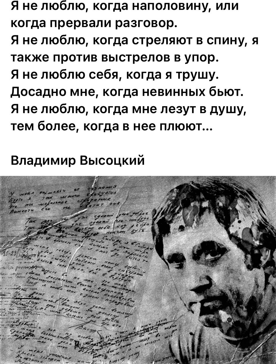 Капелька, Вот не нравилось ему....Владимеру Высоцкому...когда в душу плюют-скололся. А стишки в рифму. Иногда, когда поют...например-"Дым, песня...у мен в нутри....нет не какой любви-мне это доказали". классно звучит, так. что любовь появляется от мотива, а логика слов-"нет любви-мне это доказали(!)" Вопрос-что у неё внутри? В башке? В душе Любовь. А душа-что у неё за душа? Вот, что у Высоцкого внутри...после такого...а нравиться ведь. Скололся он и это беда...Поэт берёт на себя грешки общества. И умерает. Пророки так же. Убивают.....